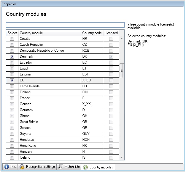 - Select which country modules you want to use with your LPR camera (see Country modules tab)