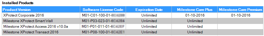 Here you can see information about your current Milestone Care™ level. When you bought your system, you also entered a two-year Milestone Care Plus subscription. Your installation is always covered by Milestone Care Basic which gives you access to different types of self-help material like knowledge base articles, guides and tutorials on our Support website (https://www.milestonesys.com/support/). The expiration date of your Milestone Care Plus subscription is visible in the Installed Products table.If you decide to buy or renew a Milestone Care subscription after you have installed your system, you must activate your licenses before the correct Milestone Care information appear.