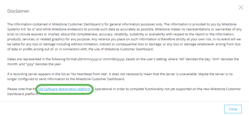 In the Disclaimer dialog box, select the link to go to the legacy software registration platform.