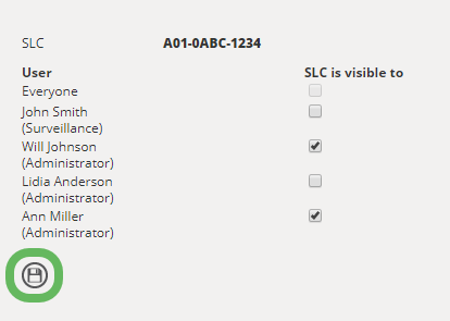In the SLC visibility dialog box, select the SLC is visible to check box next to the users that you would like to manage the license, then select the save icon.
