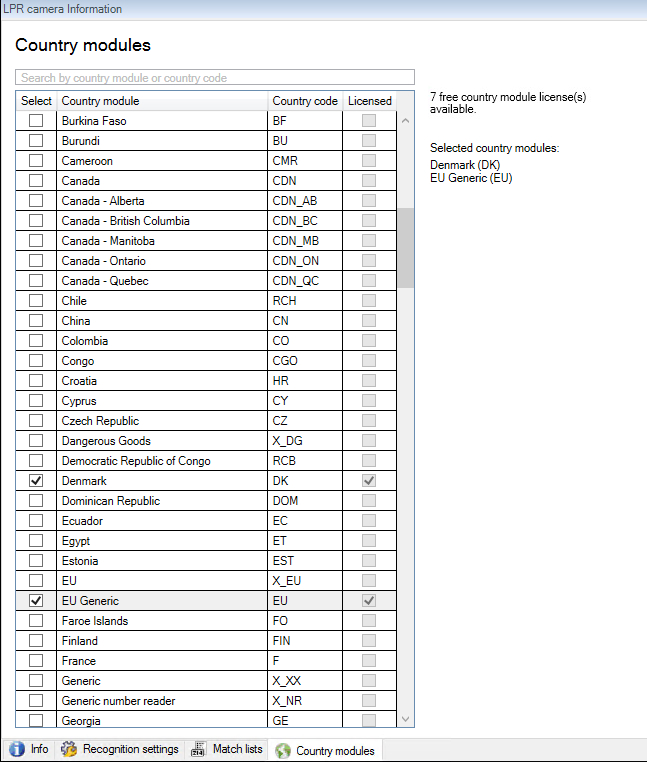 - Select which country modules you want to use with your LPR camera (see Country modules tab)