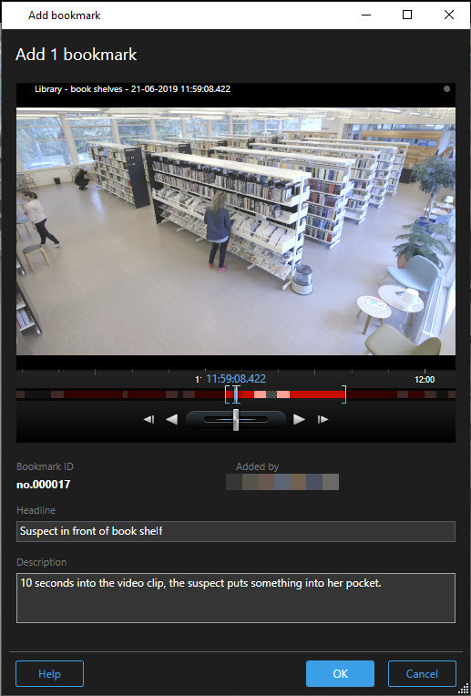 . Tras habilitar la función de detalles, aparece la ventana Marcador, en la que puede añadir una descripción pormenorizada del incidente. - Especifique un nombre para el marcador.