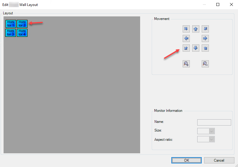to increase or decrease the size of the monitors, respectively. - Click OK to save your changes. The same layout is used in the Smart Wall overview in XProtect Smart Client.