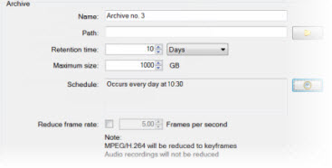 The retention time and size setting for archives define how long the recordings remain in the archive. Recordings remain in the archive for the time specified, or until the archive has reached the specified size limit. When these settings are met, the system begins to overwrite old recordings in the archive.