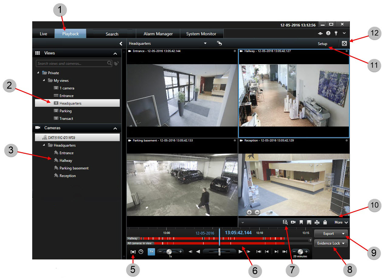 En la pestaña Reproducción, todas las cámaras en una vista muestra las grabaciones desde el mismo punto en el tiempo, el tiempo maestro. Puede reproducir o explorar las grabaciones utilizando la línea temporal. Consulte también Controles de navegación por tiempo (resumen).
