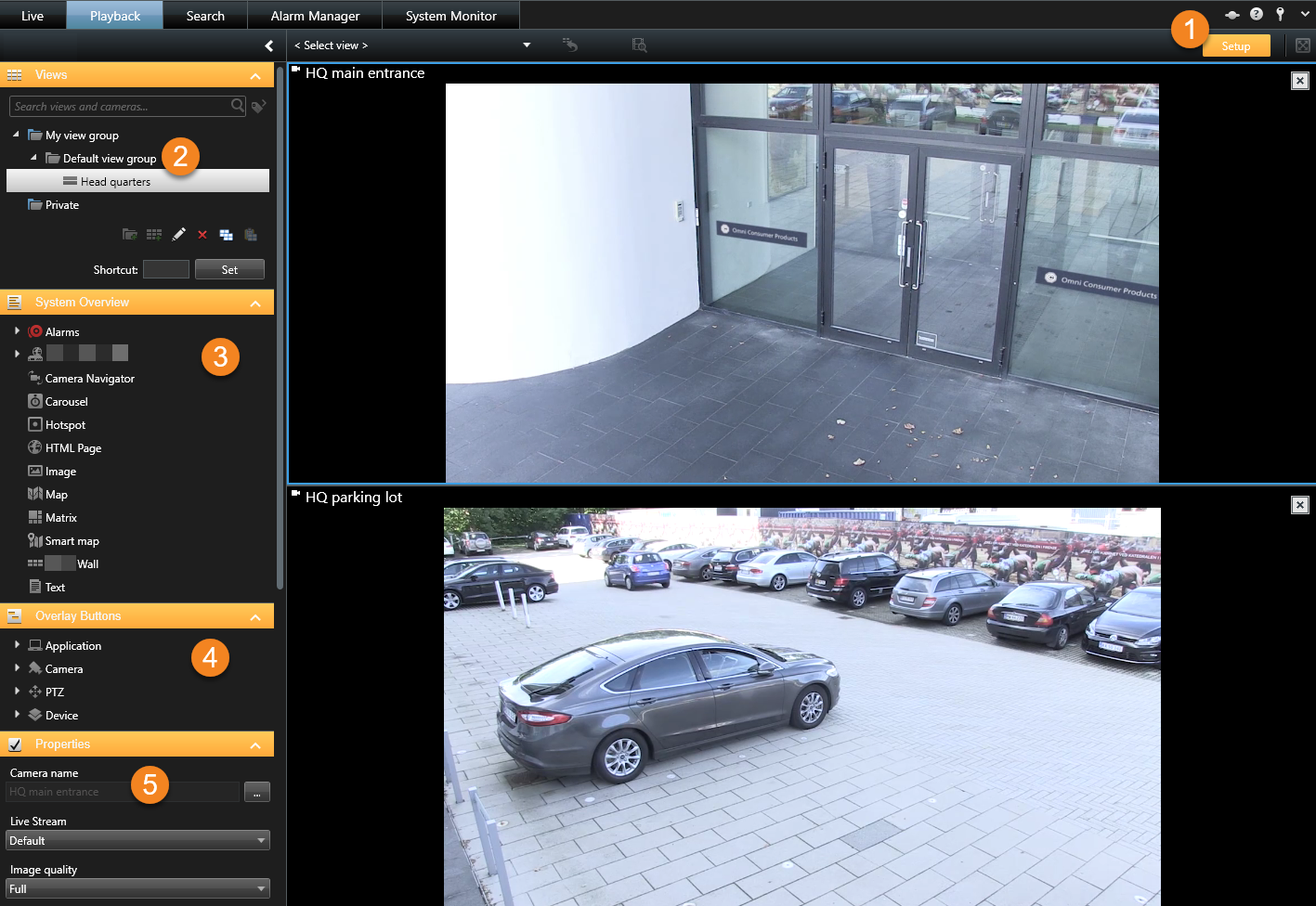 En el modo configuración, puede crear vistas para sus dispositivos y otros tipos de contenido, puede agregar botones superpuestos y establecer las propiedades de las cámaras y otros tipos de dispositivos.