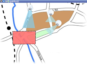 En el plano se muestra una cámara fija con una zona de la vista asociada, que indica el ángulo de visión de la cámara. Tenga en cuenta que el ángulo del plano probablemente necesite ajustarse para que coincida con el ángulo de visión real de la cámara. Para ajustar el ángulo, solo tiene que arrastrarlo hasta lograr un tamaño y una posición adecuados.