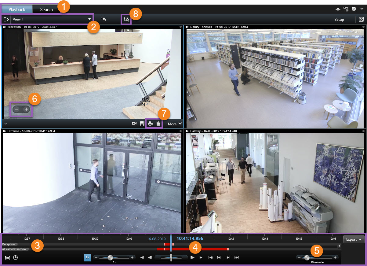 Investigar las grabaciones exportadas en la pestaña Reproducción, y ejecute búsquedas en la pestaña Buscar. |