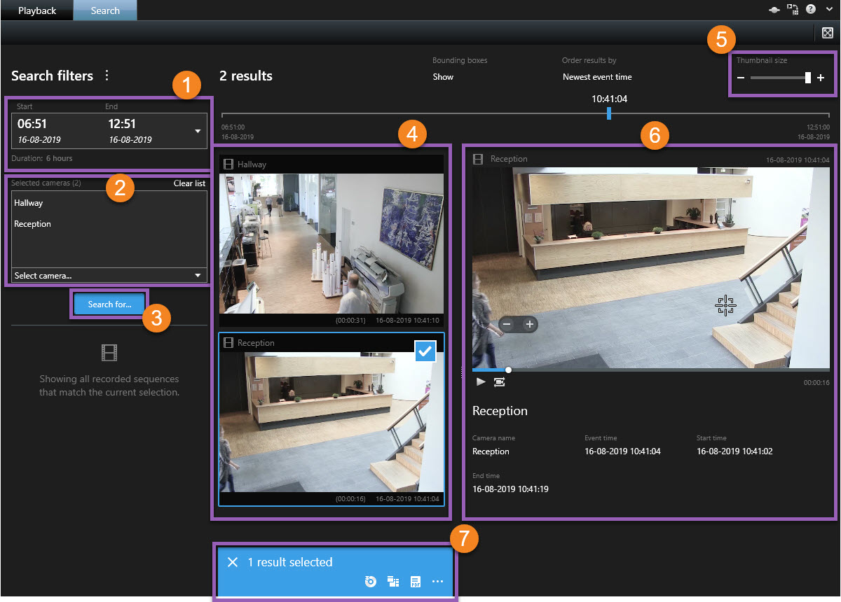 En la pestaña Buscar, puede buscar las grabaciones incluidas en la exportación, por ejemplo si desea buscar un subconjunto de las cámaras.