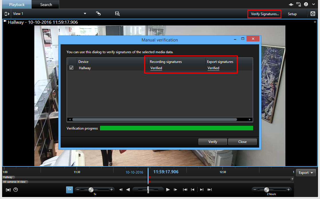 - Haga clic en Verificar para iniciar el proceso de verificación. El sistema comprueba la autenticidad de la firma de grabación y de la firma de exportación.