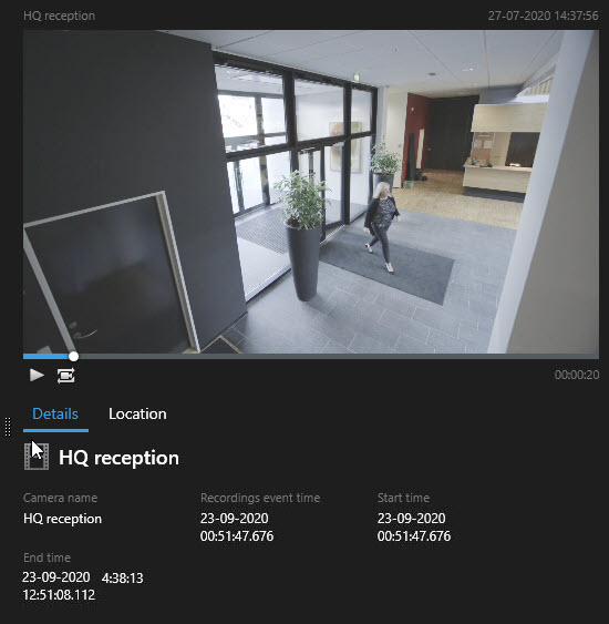 Utilice la búsqueda avanzada para encontrar grabaciones de vídeo de una persona que esté entrando a través de una entrada que esté monitorizada por múltiples cámaras.