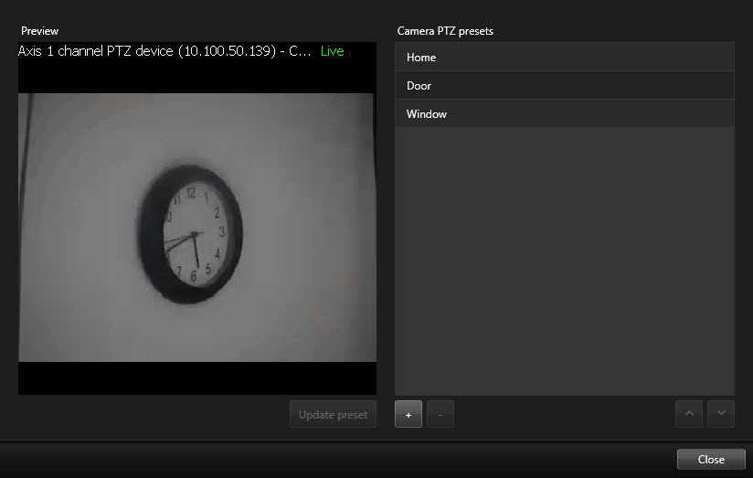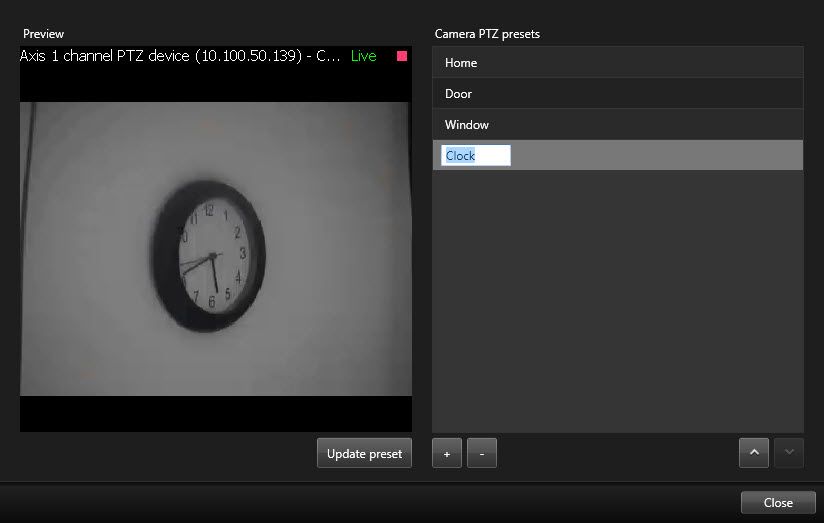 - Si la cámara no está en la posición correcta, use los botones PTZ para navegar hasta la posición requerida y haga clic en Actualizar valor preestablecido para guardarlo.