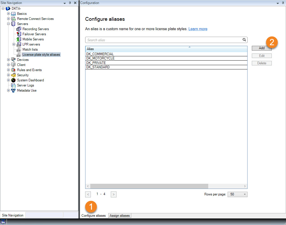 Select Site Navigation > Servers > License plate style aliases > Configure aliases.