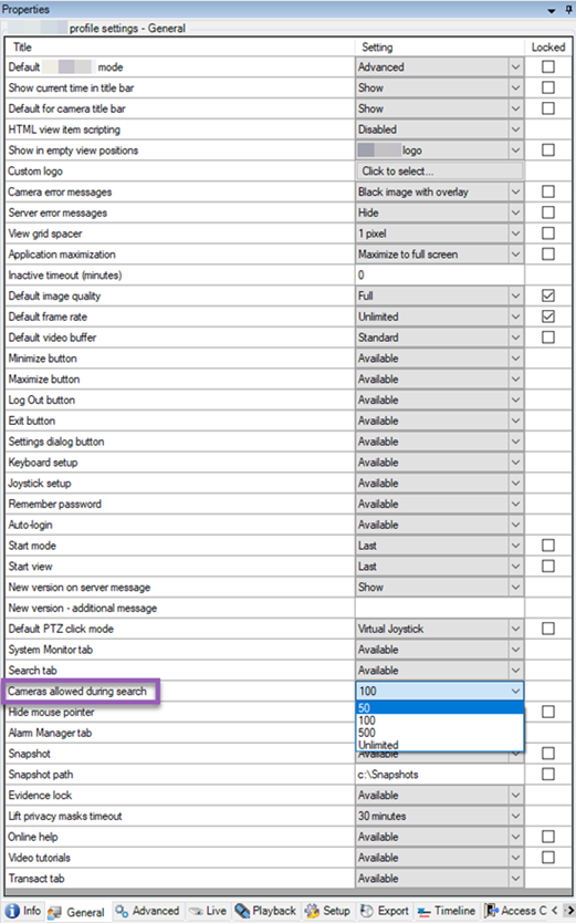 You can configure how many cameras the operators can add to a search in XProtect Smart Client. The default value is 100. If exceeding the camera limit, the operator receives a warning.