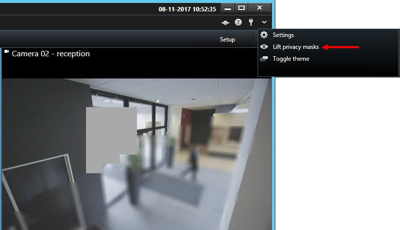 En oskarp eller solid färg som täcker ett område av videon i kameravyn. De definierade områdena är oskarpa eller täckta i klienternas live-, uppspelnings-, hotspot-, karusell-, smartkarta-, smartsökning- och exportlägen.. Det kan enbart göras för integritetsmasker som din systemadministratör har angett som lyftbara integritetsmasker i Management Client och om du har tillräckliga användarrättigheter.