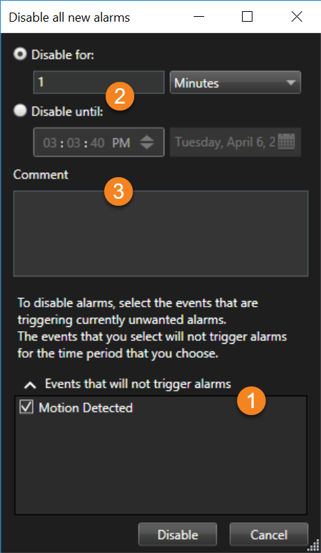 Om det till exempel är mycket rörelse runt en kamera och detta skapar återkommande falsklarm så kan du inaktivera larm för rörelsedetektering för den kameran i 10 minuter. Rörelsedetektering för kameran kommer då inte att utlösa larm på 10 minuter. På så sätt blir du inte störd av falsklarm och kan fokusera på de larm som behöver din uppmärksamhet.