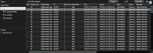 På vänster sida i larmlistan kan du se de servrar som larmen kommer ifrån. Många XProtect VMS-system har bara en enda server medan vissa system kan utgöras av ett flertal servrar i en hierarki. Alla servrar du har tillgång till listas, och du kan filtrera larm per server.