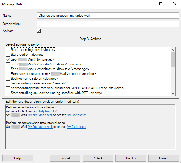 En fördefinierad layout för en eller fler Smart Wall-bildskärmar i XProtect Smart Client. Förinställningar fastställer vilka kameror som visas och hur innehåll struktureras på respektive bildskärm på videoväggen. kan du kontrollera och automatisera vad som visas på din videovägg. Till exempel kan en regel utlösa din videovägg att visa en viss Smart Wall-förinställning under en viss dag. Du kan till och med använda regler för att kontrollera vad individuella bildskärmar visar.