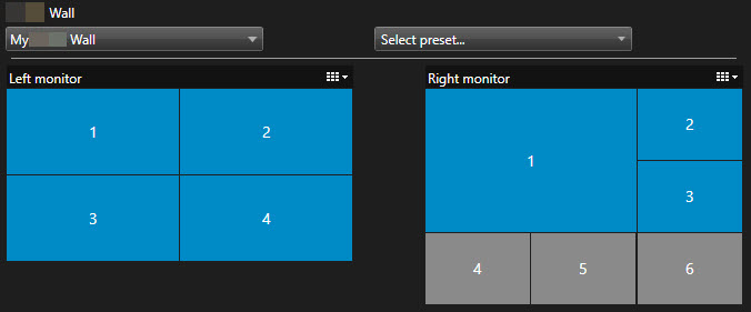 Listan Välj förinställning låter dig välja och aktivera redan konfigurerade Smart Wall-förinställningarStängdEn fördefinierad layout för en eller fler Smart Wall-bildskärmar i XProtect Smart Client. Förinställningar fastställer vilka kameror som visas och hur innehåll struktureras på respektive bildskärm på videoväggen..