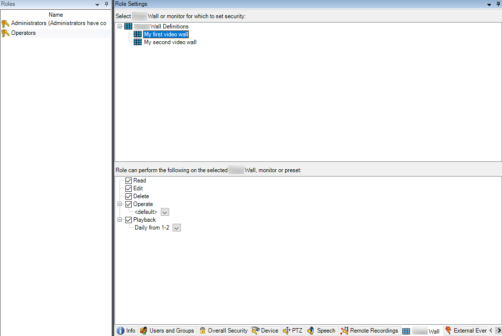 Inställningarna som beskrivs i detta avsnitt avser Roller i XProtect Management Client. För att ställa in användarbehörigheter för alla Smart Wall-definitioner, gå till fliken Övergripande säkerhet. För att ställa in användarbehörigheterna för specifika Smart Wall-definitioner, gå till fliken Smart Wall.