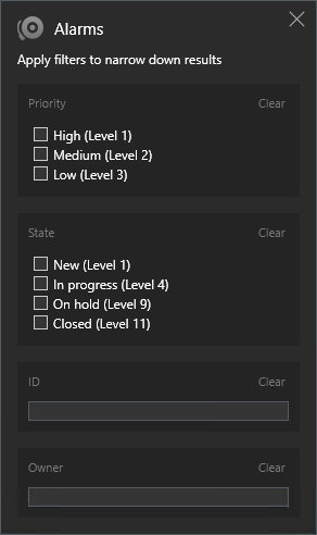 När du väljer flera värden inom ett filter, till exempel Hög, Medium och Låg inom filtret Prioritet, filtrerar du efter resultat som matchar minst ett av dessa värden.