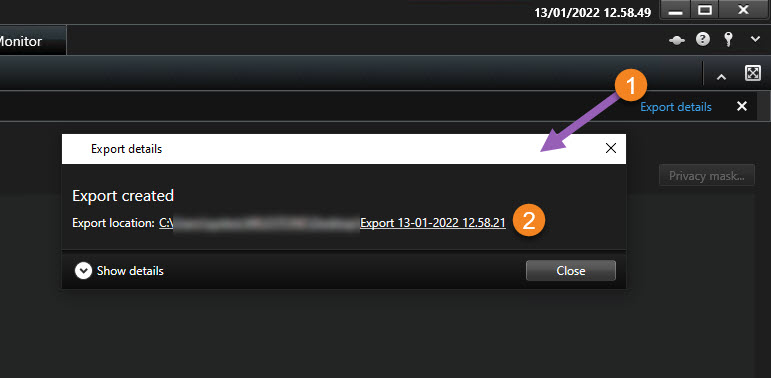 - Beroende på utdataformat öppnar du relevant mapp och dubbelklickar på videofilen eller stillbilden. Om formatet är XProtect-format dubbelklickar du på Smart Client – Player-filen med filtillägget .exe.