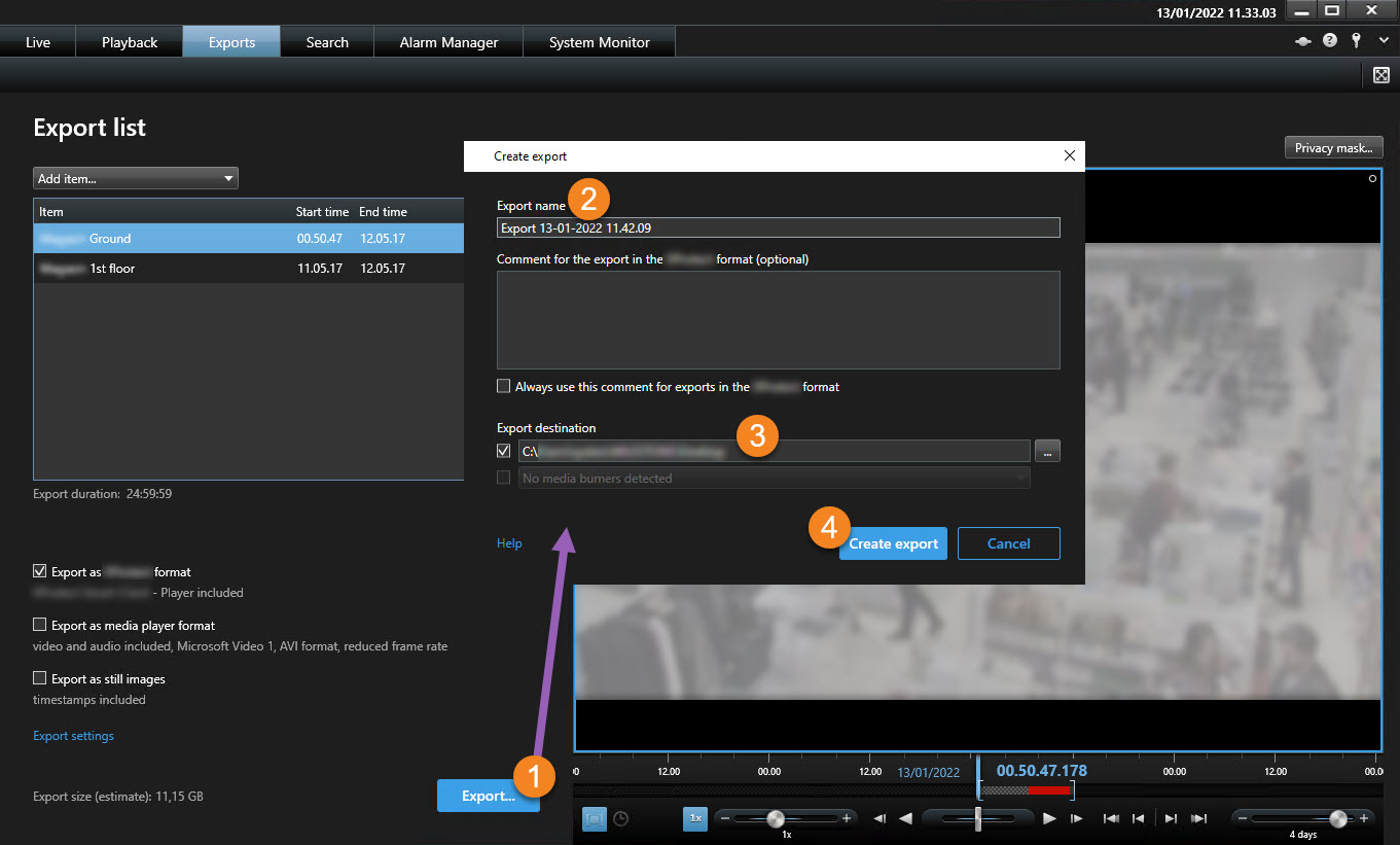 Exportens varaktighet och antal kameror påverkar hur lång tid det tar att slutföra exporten. För att reducera tidsförbrukningen kan du försöka ändra exportformatet.