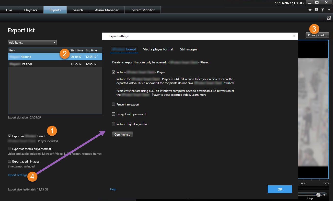 - Exportera i XProtect-format - använd XProtect-format om du vill inkludera XProtect Smart Client – Player i din export. Andra mediaspelare fungerar inte. Om du vill att mottagaren ska kunna verifiera att de exporterade bevisen inte har manipulerats, markerar du Exportinställningar > XProtect-format > Inkludera digital signatur. Detta aktiverar knappen Verifiera signaturer i XProtect Smart Client – Player