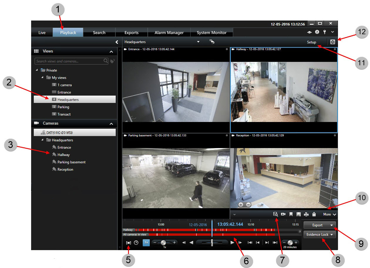 Du undersöker incidenter huvudsakligen på fliken Uppspelning genom att använda tidslinjen för att bläddra i inspelad video. För att se inspelad video måste du hitta en vy som visar video från de kameror du är intresserad av. Vyerna är tillgängliga i rutan Vyer. För varje kamera som visas i en vy finns olika åtgärder tillgängliga, till exempel ta stillbilder eller påbörja sökning. Se även Kameraverktygsfält (översikt). Om något fångar din uppmärksamhet kan du med den virtuella styrspaken zooma in för att ta en närmare titt.