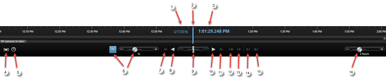 - Den nedre tidslinjen är för alla kameror i vyn, inklusive den valda kameran. Om du har länkade flytande fönster kommer även dessa att inkluderas på den nedre tidslinjen