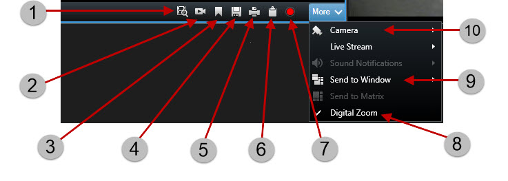 Kameraverktygsfältet visas när pekaren hovrar över en kamera inne i en vy. Kameraverktygsfältet är tillgängligt både på fliken Live och fliken Uppspelning.