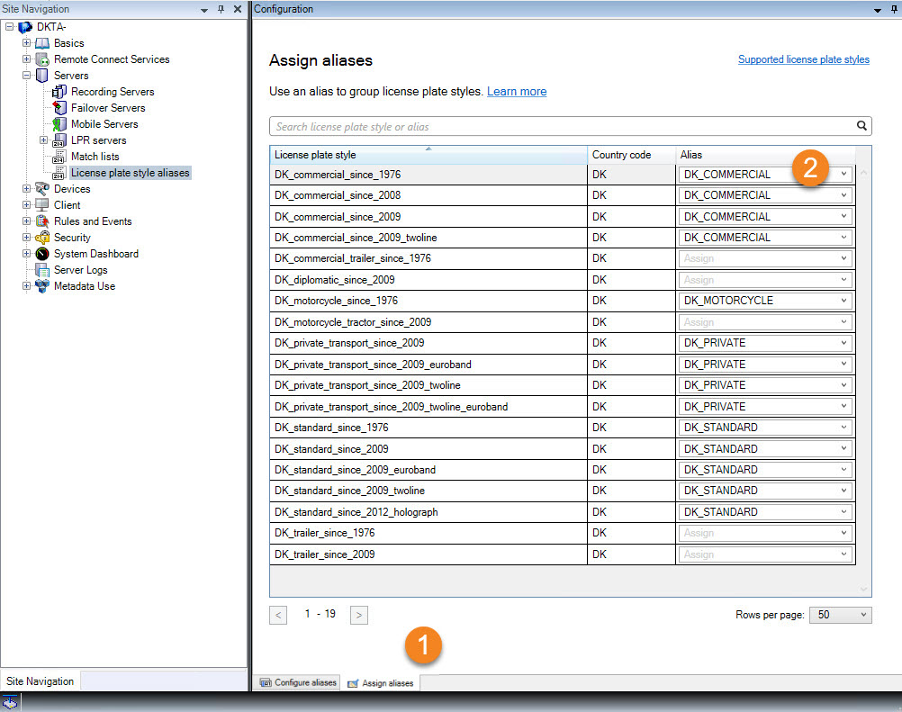 In this example, we created aliases and assigned them to license plate styles. A possible next step is to add the aliases to match lists. That way, we can associate different groups of license plate styles with different LPR events. For example, we can open a gate to a vehicle only if the license plate style of the vehicle is part of the DK_COMMERCIAL alias. See Match lists.