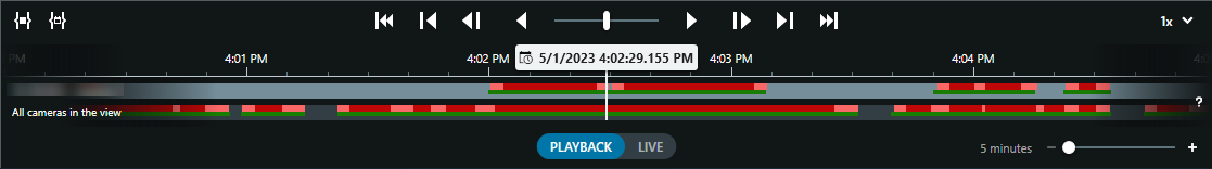 The vertical line shows the location of the playhead from where recordings are currently played back. This is called the main playback time, and the text above shows the exact date and time for the video currently played back. The main playback time applies to all the cameras in the view and any synchronized views unless you are viewing independent playback from some of the cameras. If there is no recorded video from one or more cameras in the view matching the main playback time, the last frame from the camera database before the main playback time is shown, but the frame is dimmed.