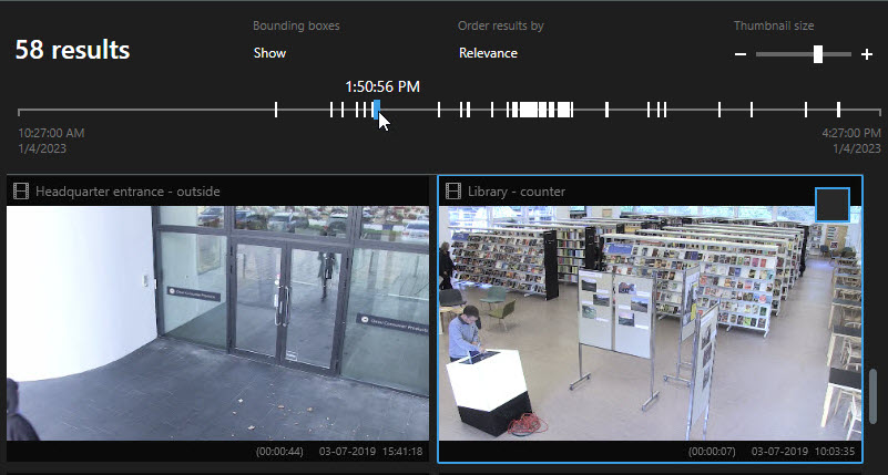 The bounding boxes mostly appear in the thumbnail images of your search results. However, if your VMS system is configured to search for metadata, bounding boxes may also appear when you preview video from the search results.