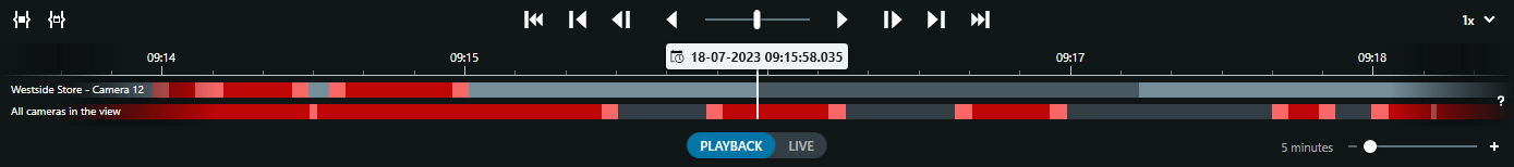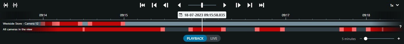 The possibility to retrieve the Edge Storage recordings is visualized by replacing the normally black space between recordings on the timeline with a grey color. The grey color indicates that there might be recordings on the Edge Storage camera that can be retrieved by the XProtect Smart Client user.