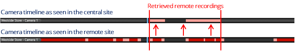 With recording enabled in the central XProtect Corporate system, the timeline for users connected to the central site will not necessarily be the same as for users connected directly to the remote site. This is because each site records by its own rules and because recordings can be retrieved (copied) from the remote site to the central site.